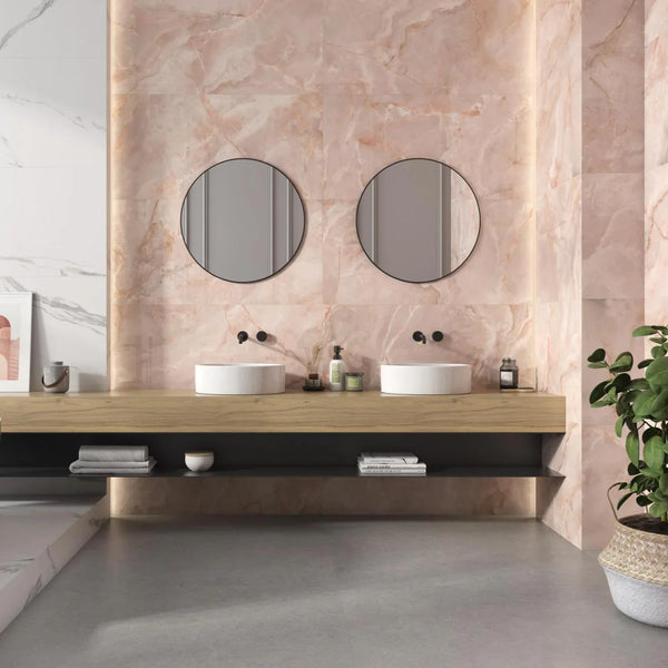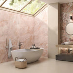 The Onyx Large Marble Pink Wall and Floor Tile 120x60cm brings a luxurious, modern feel to interiors. With its soft blush tones and elegant marble veining, this porcelain tile adds warmth and sophistication to bathrooms, kitchens, and open-plan living spaces. The large format creates a seamless finish, making smaller rooms feel more spacious and grand.